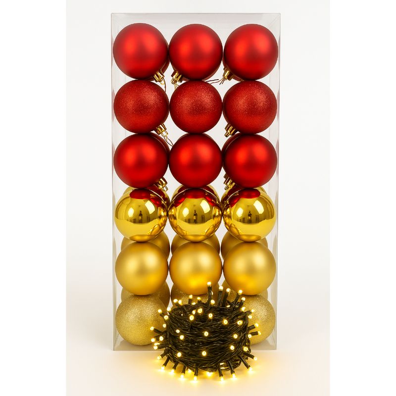 Crea un ambiente cálido y festivo con este hermoso pack decorativo, que incluye luces brillantes y coloridas bolas navideñas para transformar tu árbol y tu hogar en un verdadero espectáculo de alegría.
