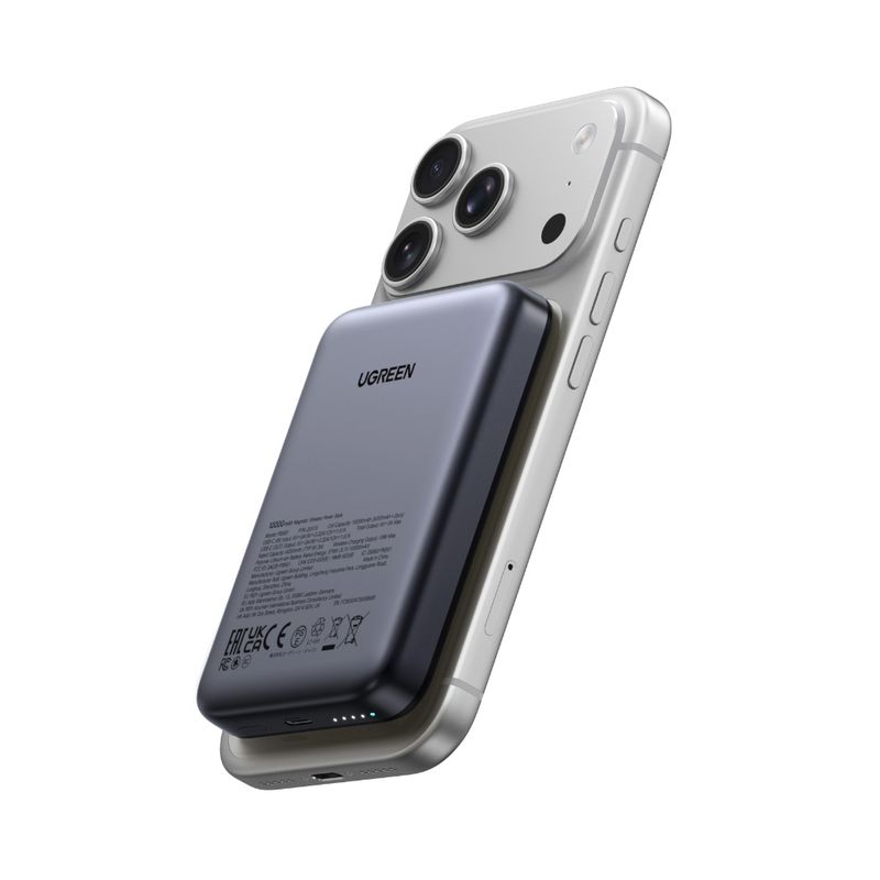 Carga tu iPhone de forma cómoda y segura con el UGREEN Power Bank Magnético de 10.000mAh. Diseñado para el ecosistema MagSafe, se adhiere con firmeza a tu teléfono y te entrega carga rápida por cable de hasta 20W (PD) o carga inalámbrica Qi de hasta 15W, ideal para el día a día, viajes o emergencias.